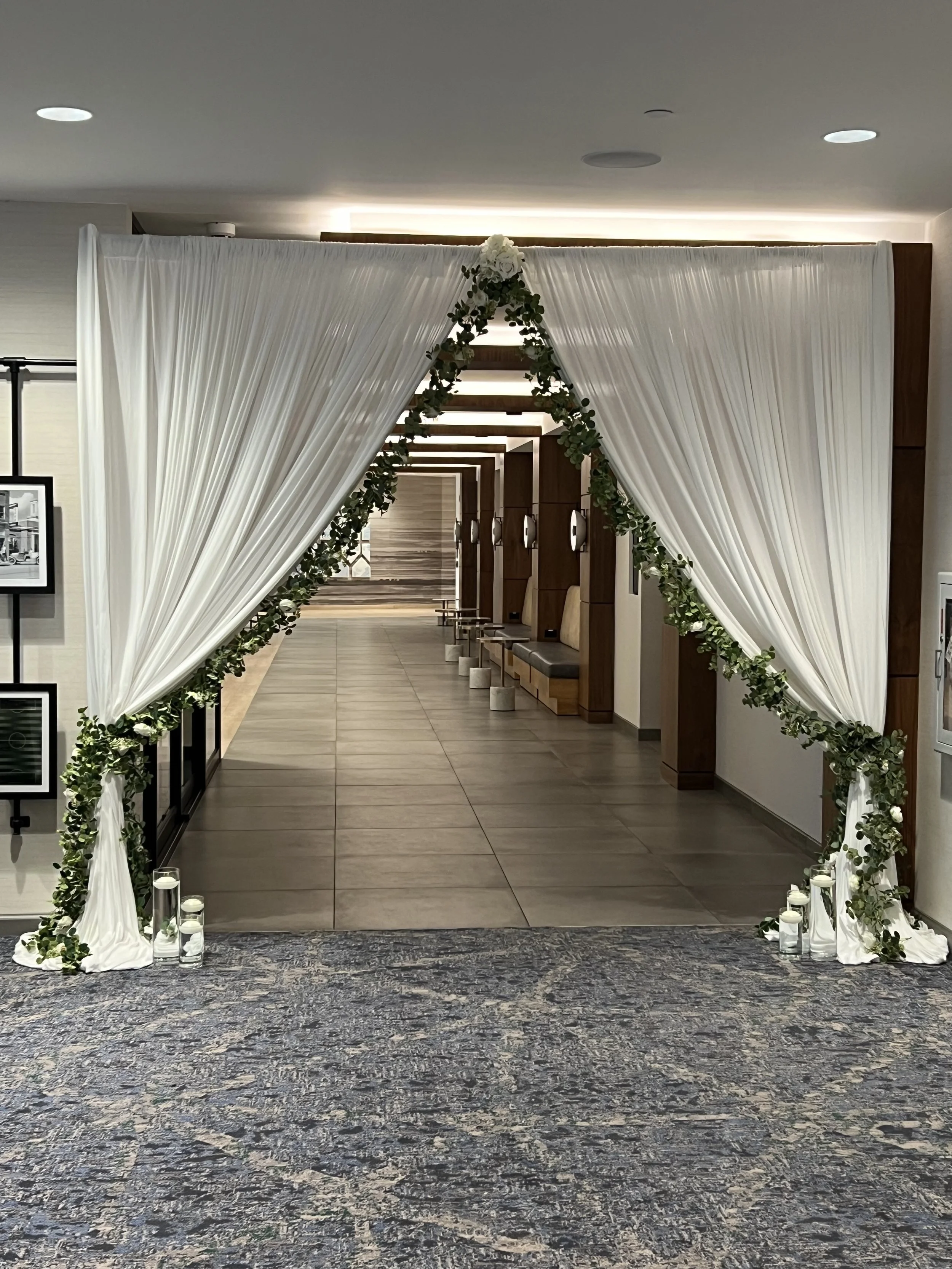 The aisle featured oversized floral arrangements, shimmering lanterns, and a dramatic backdrop of layered draping and lights. The setup radiated romance and grandeur, leaving guests awestruck as they took their seats.